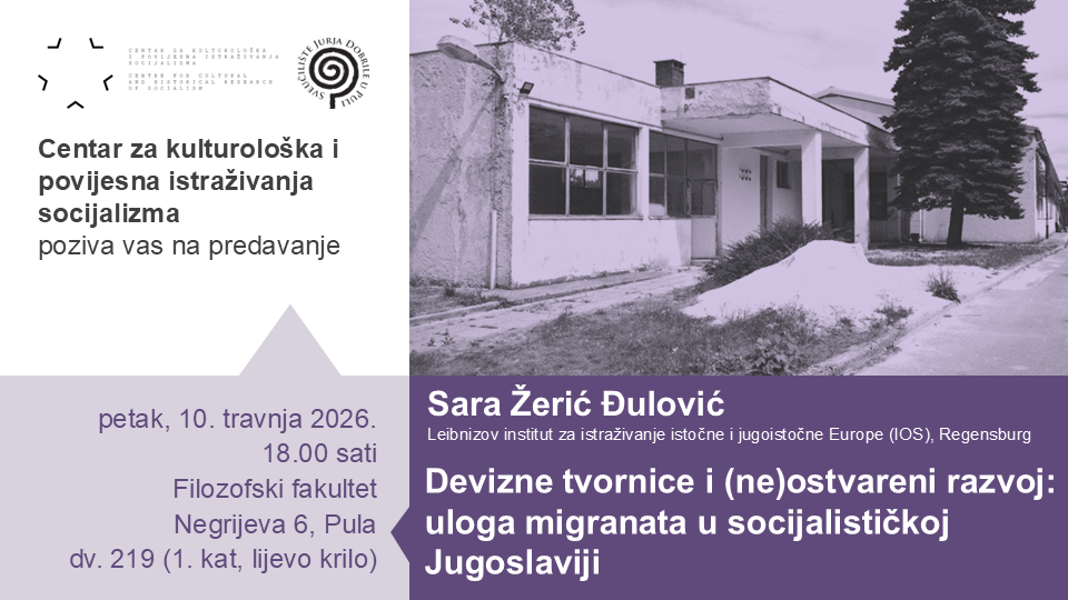 U organizaciji sveučilišnog Centra za kulturološka i povijesna istraživanja socijalizma – u petak, 10. travnja 2026., u 18.00 sati u dv. 219 na Filozofskom fakultetu u Puli (Negrijeva 6, prvi kat) – gostujuće javno predavanje pod naslovom Devizne tvornice i (ne)ostvareni razvoj: uloga migranata u socijalističkoj Jugoslaviji održat će Sara Žerić Đulović s Leibnizova instituta za istraživanje istočne i jugoistočne Europe (IOS) u Regensburgu i suradnica CKPIS-a.
