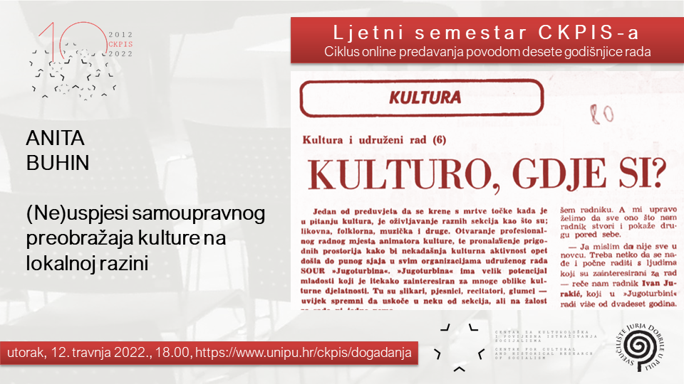 U ciklusu online predavanja Ljetni semestar CKPIS-a treća tema nosi naslov (Ne)uspjesi samoupravnog preobražaja kulture na lokalnoj razini i o njoj će govoriti Anita Buhin, naslovna poslijedoktorandica na pulskom sveučilištu i suradnica na projektu Mikrosocijalizam. Predavanje će se održati u utorak, 12. travnja 2022., u 18.00 sati u virtualnoj dvorani https://ovh.unipu.hr/b/and-