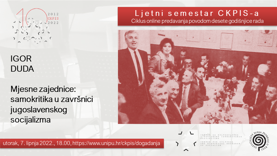 Ovogodišnji ciklus online predavanja Ljetni semestar CKPIS-a zaključuje Igor Duda s temom Mjesne zajednice: samokritika u završnici jugoslavenskog socijalizma. Predavanje će se održati u utorak, 7. lipnja 2022., u 18.00 sati u virtualnoj dvorani https://ovh.unipu.hr/b/lad-fcf-rpe-ydv.