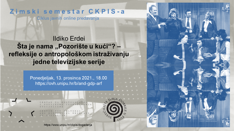Treće predavanje u Zimskom semestru CKPIS-a održat će Ildiko Erdei, redovita profesorica na Filozofskom fakultetu u Beogradu. Na temu Šta je nama „Pozorište u kući“? – refleksije o antropološkom istraživanju jedne televizijske serije govorit će u ponedjeljak, 13. prosinca 2021., u 18.00 sati u virtualnoj dvorani https://ovh.unipu.hr/b/and-gdp-arf.