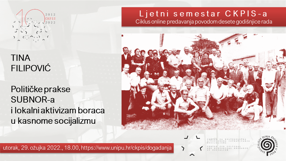 Druga su tema Ljetnog semestra CKPIS-a, ciklusa online predavanja kojim se ove godine obilježava deseta godišnjica rada Centra, Političke prakse SUBNOR-a i lokalni aktivizam boraca u kasnome socijalizmu, o čemu će govoriti Tina Filipović, doktorandica na projektu Mikrosocijalizam. Predavanje će se održati u utorak, 29. ožujka 2022., u 18.00 sati u virtualnoj dvorani https://ovh.unipu.hr/b/and-