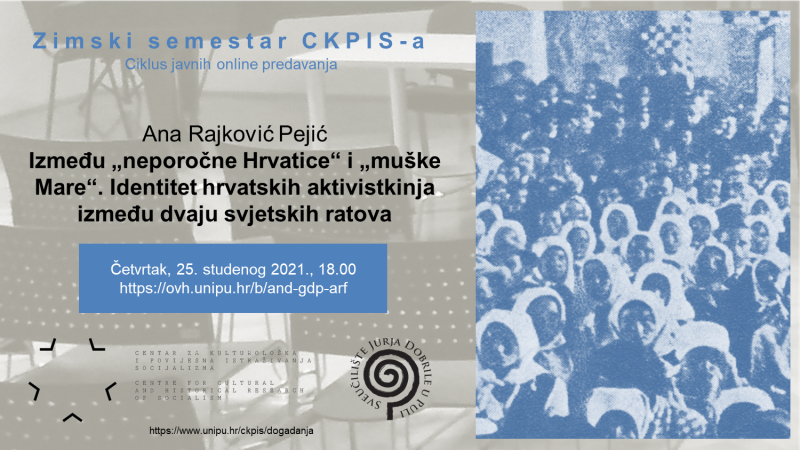 Druga gošća Zimskog semestra CKPIS-a je Ana Rajković Pejić koja će održati predavanje pod naslovom Između „neporočne Hrvatice“ i „muške Mare“. Identitet hrvatskih aktivistkinja između dvaju svjetskih ratova. Očekujemo vas u četvrtak, 25. studenog 2021., u 18.00 sati u virtualnoj dvorani https://ovh.unipu.hr/b/and-gdp-arf.