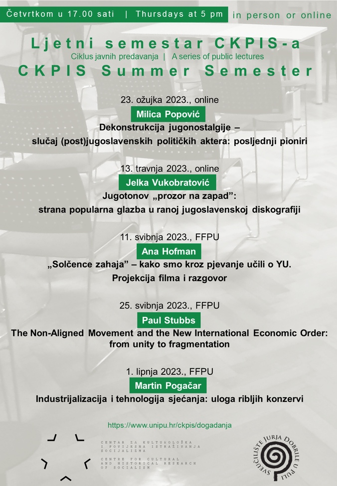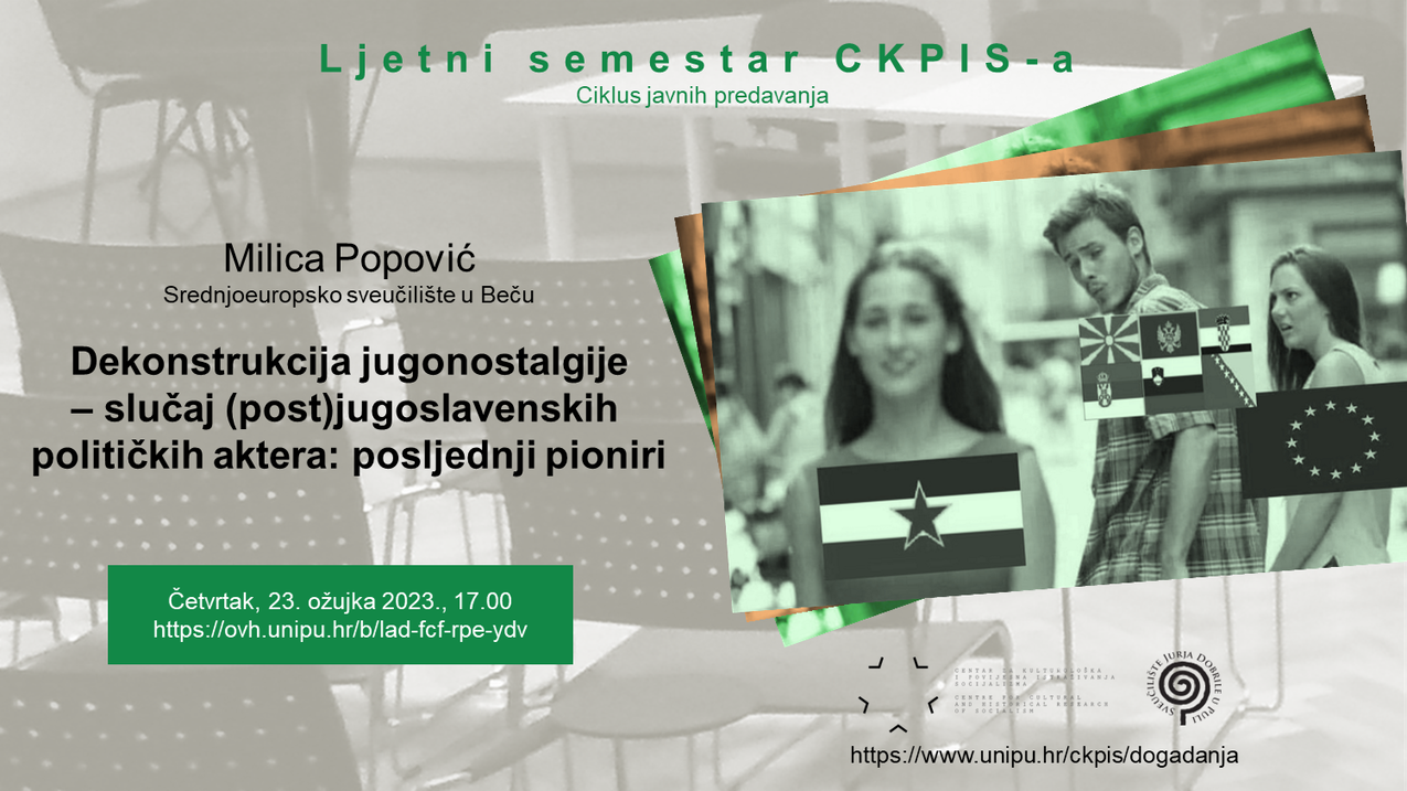 Ciklus predavanja Ljetni semestar CKPIS-a otvara Milica Popović sa Srednjoeuropskog sveučilišta u Beču, koja će govoriti na temu Dekonstrukcija jugonostalgije – slučaj (post)jugoslavenskih političkih aktera: posljednji pioniri. Predavanje će biti održano isključivo online u četvrtak, 23. ožujka 2023., u 17.00 sati u virtualnoj dvorani https://ovh.unipu.hr/b/lad-fcf-rpe-ydv.