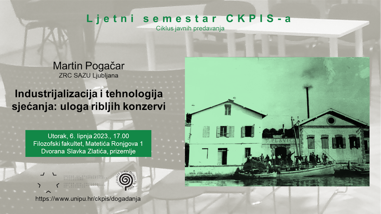 Posljednji gost ciklusa javnih predavanja Ljetni semestar CKPIS-a je Martin Pogačar sa Slovenske akademije znanosti i umjetnosti. Predavanje pod naslovom Industrijalizacija i tehnologija sjećanja: uloga ribljih konzervi održat će u utorak, 6. lipnja 2023., u 17.00 sati u Dvorani Slavka Zlatića, u prizemlju Filozofskog fakulteta u Puli, Matetića Ronjgova 1.