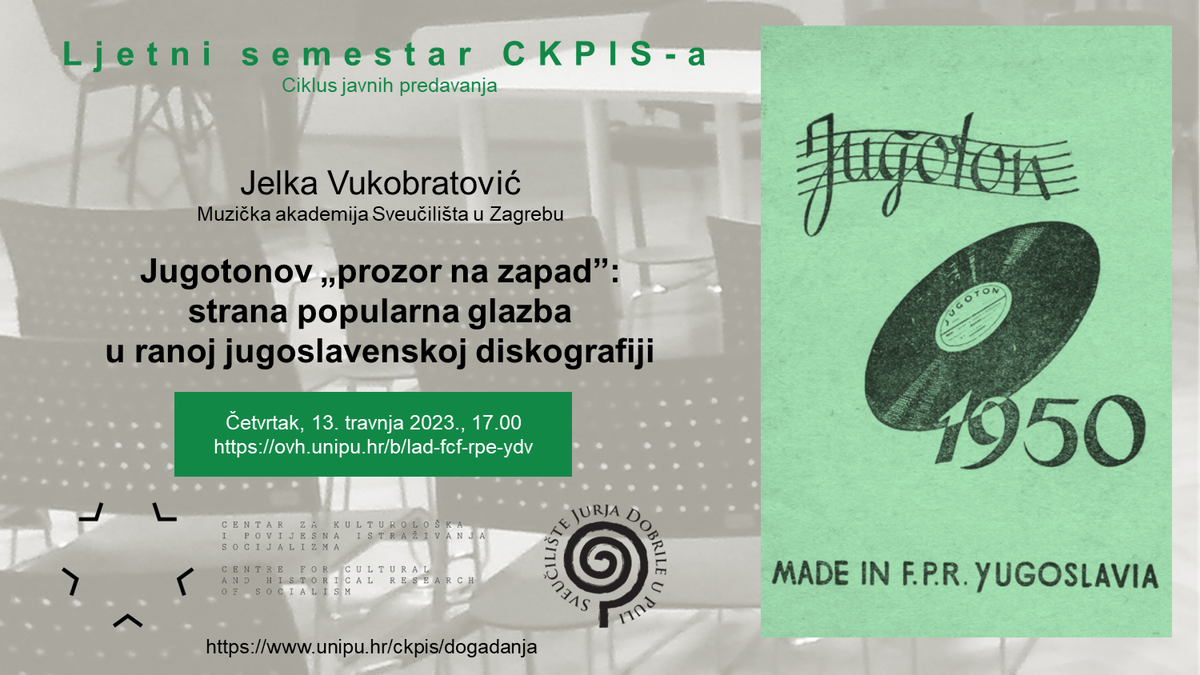 Druga gošća Ljetnog semestra CKPIS-a je Jelka Vukobratović, etnomuzikologinja i docentica na Odsjeku za muzikologiju Muzičke akademije Sveučilišta u Zagrebu, koja će govoriti na temu Jugotonov „prozor na zapad“: strana popularna glazba u ranoj jugoslavenskoj diskografiji. Predavanje će biti održano isključivo online u četvrtak, 13. travnja 2023., u 17.00 sati u virtualnoj dvorani https://ovh.unipu.hr/b/lad-fcf-rpe-ydv.