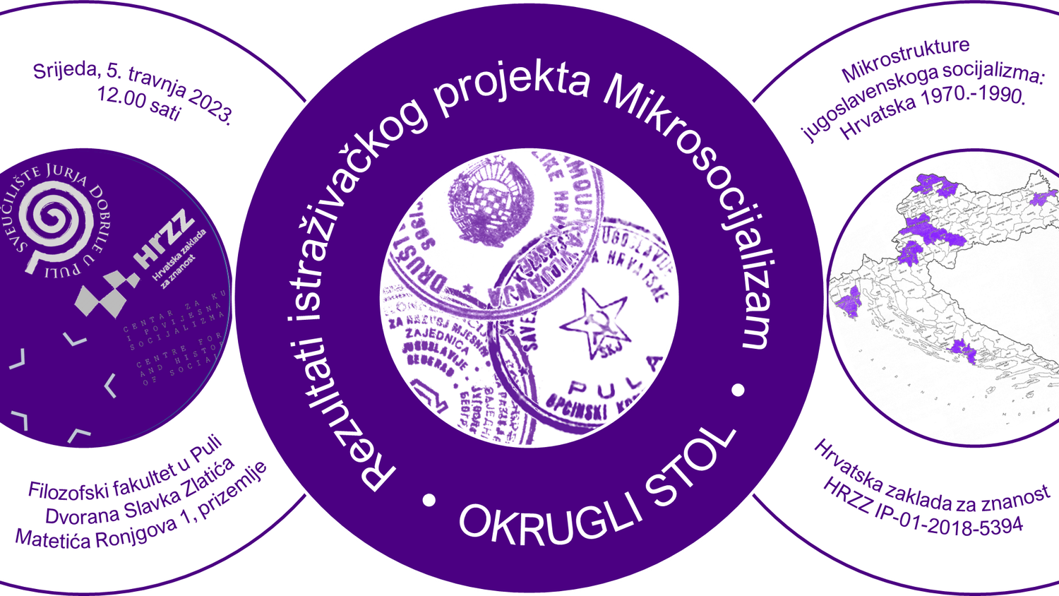 Istraživački projekt Mikrostrukture jugoslavenskoga socijalizma: Hrvatska 1970-1990. (Mikrosocijalizam, HRZZ IP-01-2018-5394) primiče se svome kraju. Suradnici se okupljaju na zadnjem radnom sastanku poslije kojega će u srijedu, 5. travnja 2023., u 12.00 sati u Dvorani Slavka Zlatića, u prizemlju Filozofskoga fakulteta u Puli, za javnost održati okrugli stol na kojem će govoriti o tijeku istraživanja, polazištima i konačnim rezultatima.