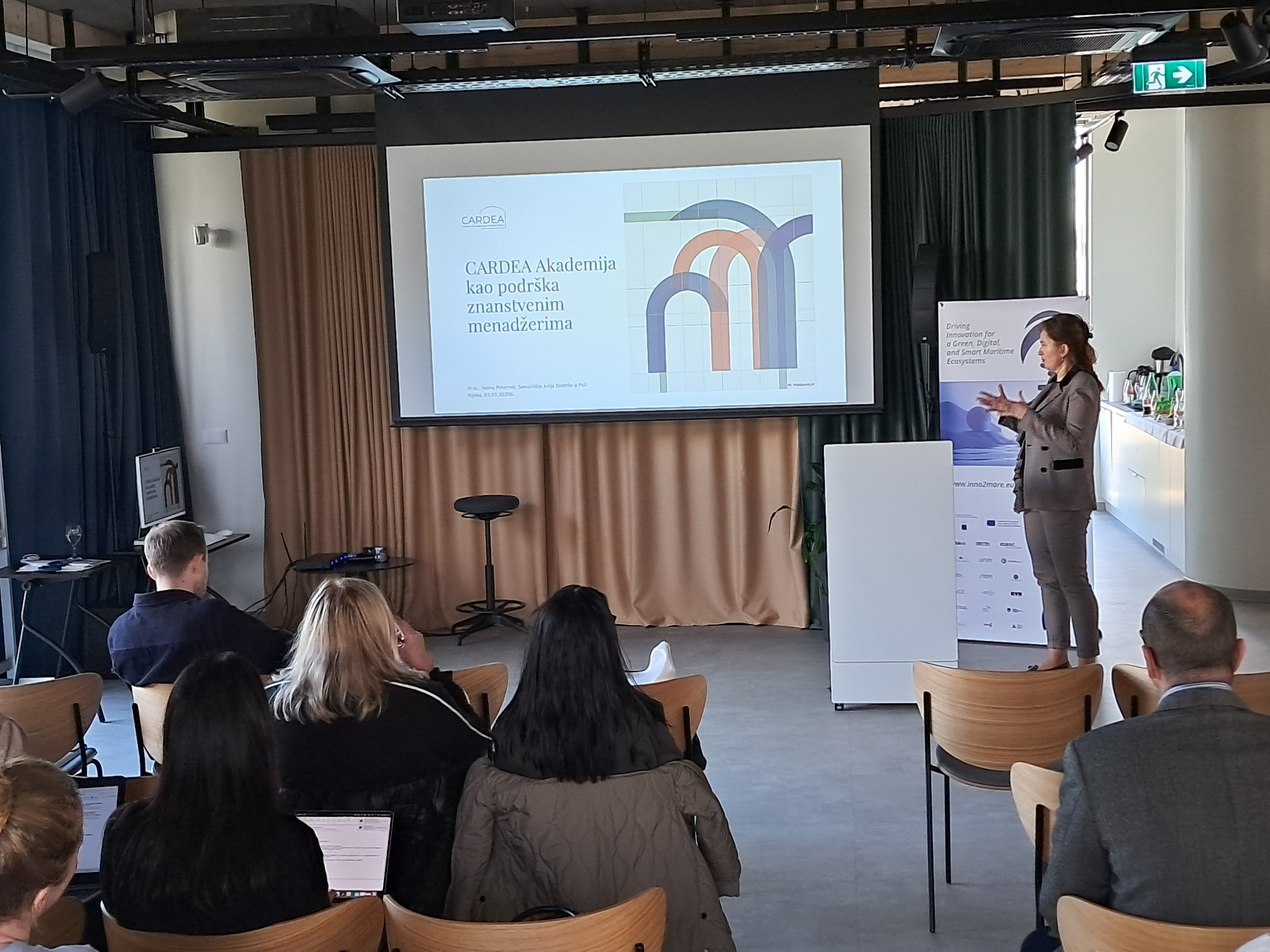 In the central part of the workshop, Deni Nurkić from the Nikola Tesla Innovation Center, founder of the deep tech venture builder Nuqleus, and head of EDIH services Crobohub++, gave a presentation aimed at better clarifying what intellectual property encompasses and how to effectively protect and transfer it to the market. Ivona Peternel, PhD, from Juraj Dobrila University in Pula, presented the CARDEA Academy and career development opportunities for research managers, with special emphasis on the development of competencies necessary for working on innovation and research projects. The workshop was concluded with a question-and-answer session, confirming the academic community's interest in concrete models of knowledge transfer and strengthening the entrepreneurial dimension of research.