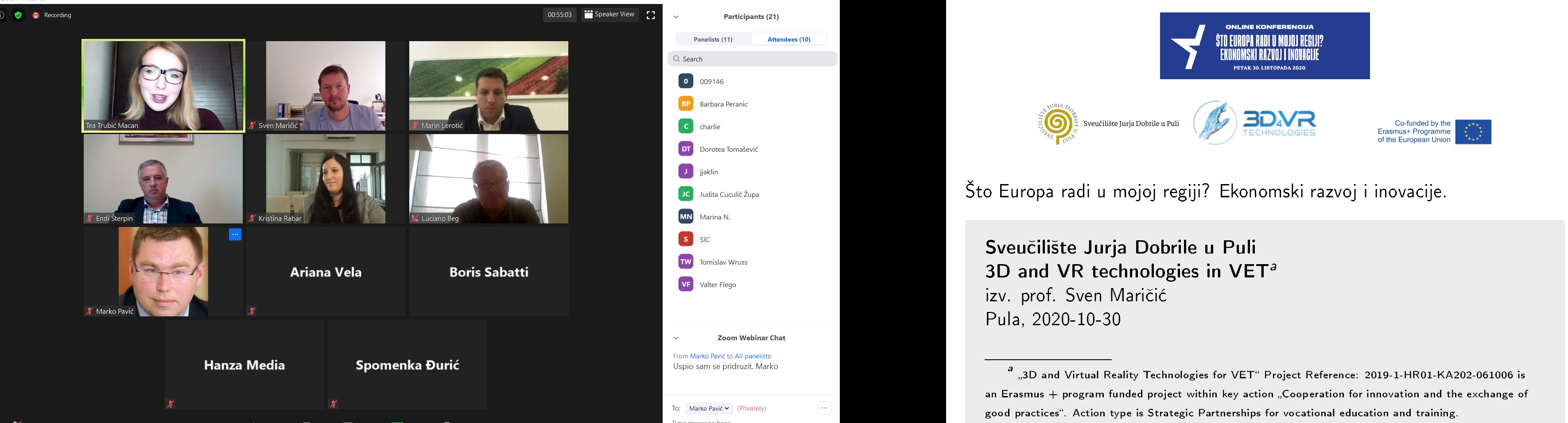 Within organization of newspaper „Jutarnji List“ online roundtable „Europe in my region“+- Economic Development and Innovation“ was held on the 30th October. General project manager Assoc. Prof. Sven Maričić has presented the „3DandVRforVET“ project results.