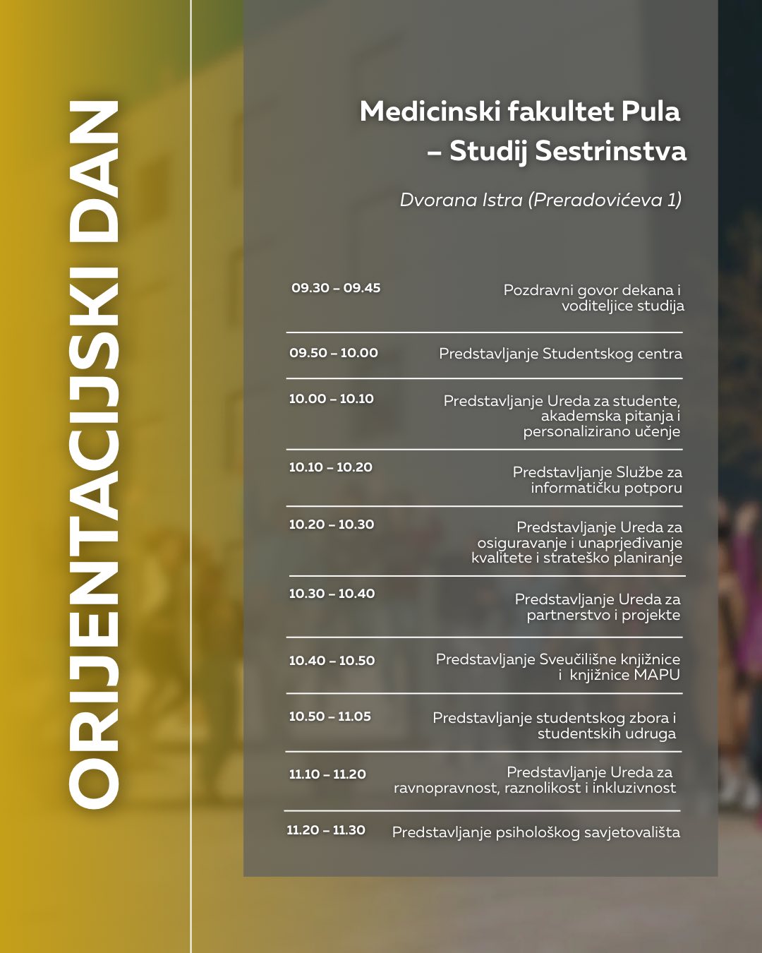 NAPOMENA: Obratite pozornost na adrese događaja, za pojedine fakultete Orijentacijski će se dan održati u novom kampusu na adresi Negrijeva 6, gdje se nastava tih fakulteta i izvodi.